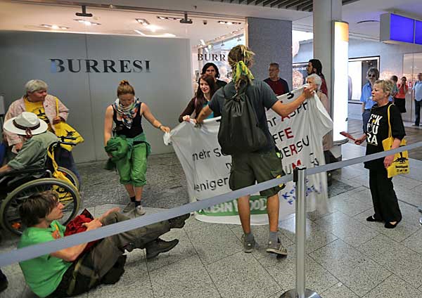 23.06.2014 Aktion: Blockade eines Zuganges zum Transitbereich des Frankfurter Flughafens, Terminal 1, Halle B, Ebene 2, von etwa 19.05 bis 19.30 Uhr. Beginn der Blockadeaktion.