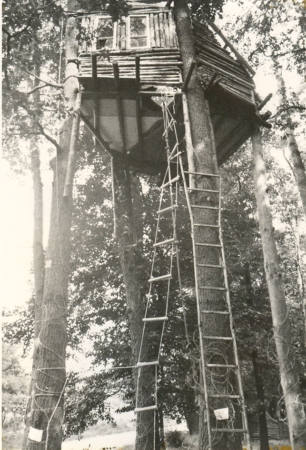 Baumhaus, "gesichert" mit Stacheldraht und einziehbaren Leitern.