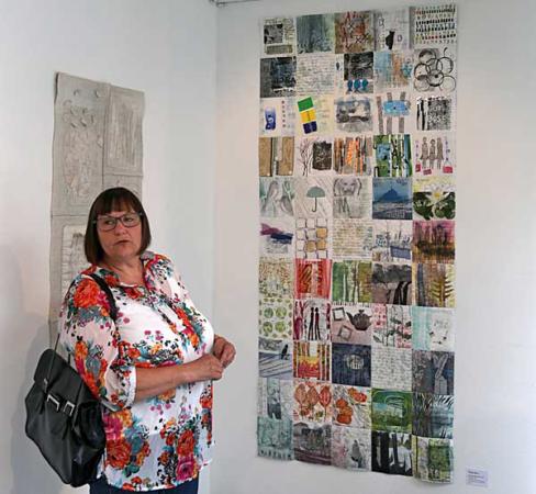 Kulturstammtisch Ausstellung 10 Jahre Kulturstammtisch Stadtmuseum Groß-Gerau Jutta Sauerborn erläutert eine Arbeit von Meggi Marx (Tagebuch)