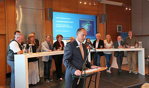 Kulturstammtisch Live René Lorenz (Regionalmarktleiter der Volksbank) begrüßt Künstler und Gäste.