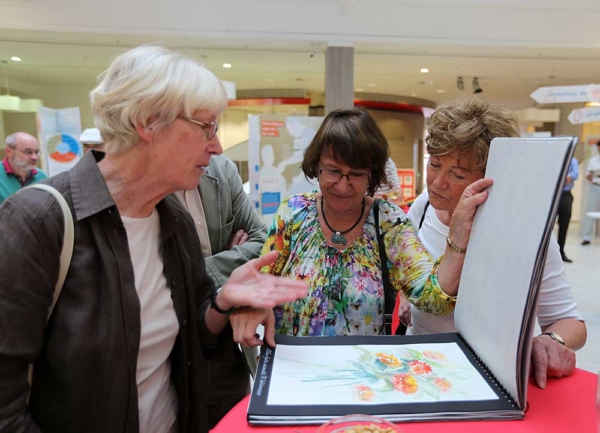 Helga Schürmeiser (l.) und Edelgard Rietz (Mitte) beim Betrachten des von Künstlern gestalteten Geschenks für W. C. Schmitt (siehe auch Ausstellung 10 Jahre Kulturstammtisch)