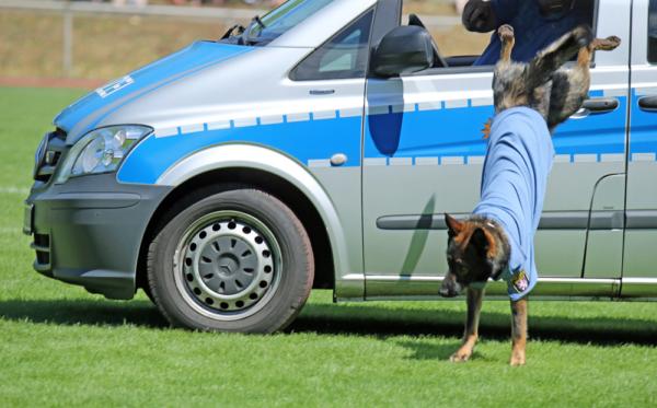 Der Hund, eingesetzt als Fahrer des Dienstfahrzeuges und vorschriftsmäßig mit Diensthemd bekleidet,