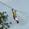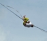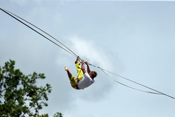 57. Hessentag in Rüsselsheim Lukas Irmler während seiner spektakulären Highline-Vorführung auf einer Slackline von der Stadtkirche zum Rathausdach