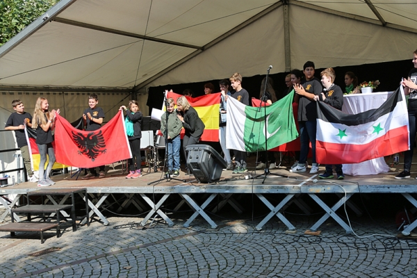 Schüler der der Martin-Buber-Schule präsentieren einige Flaggen der beteiligten Nationen bei den Interkulturellen Wochen.