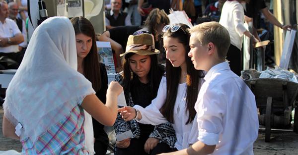 Oberstufenschüler der Ricara-Huch-Schule stellen Bilder zur Geschichte des Kellers unter der Küchenbaracke sowie seiner Freilegung.
