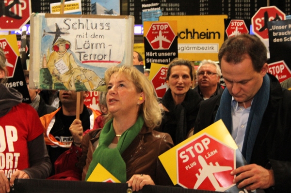 Die Biebesheimer Landtagsabgeordnete der Grünen, Ursula Hammann (Bildmitte), unterstützt den Aufruf der Bürgerinitiativen zur Montagsdemonstration gegen den Fluglärm im Terminal B des Flughafens Frankfurt und ruft die Bevölkerung ebenfalls zur Teilnahme auf.