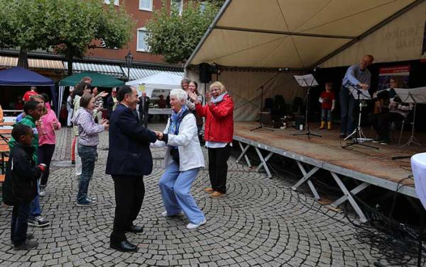 Gute Stimmung beim Folktanz unter der Leitung von Britta Draudt