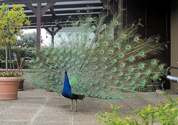 Ein wunderschönes Erlebnis - ein Pfau ohne Scheu in den Gärten und auf Hausdächern.