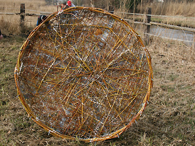 Das Storchennest. Gut zu erkennen das Weidegeflecht. Die weißen Kalkspritzer sollen Storchenkot vortäuschen und den Störchen vortäuschen, dass das Nest schon einmal "bewohnt" war.