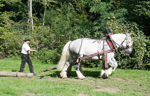 Percheron-Schimmel „Saturn“ und „Sultan“ von Holger Bauer als Rückepferde im Einsatz.