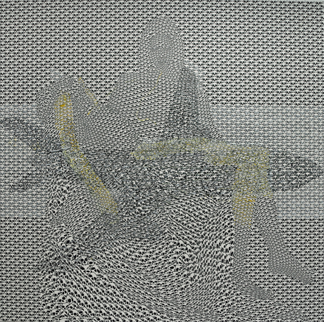 komplexe Netzstrukturen, die aus der Wiederholung von Einzelmotiven entstehen und das Verhältnis zwischen Individuum und Masse reflektieren.