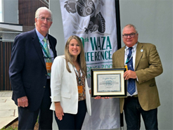 Brad Andrews, Global Director Humane Conservation™ und Jill Nizan, Director Conservation Operations, beide Global Humane, bei der Übergabe der Urkunde an Dr. Thomas Kauffels, Direktor des Opel-Zoo.
