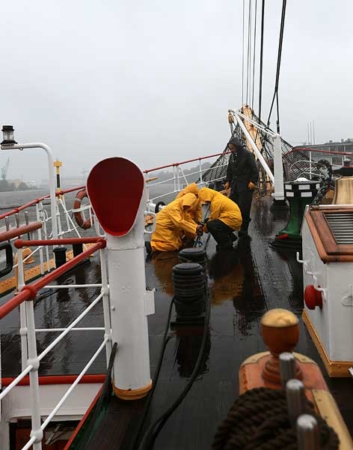 Arbeiten an Bord. Durch das Hochwasser und das dadurch begingte Anheben des Schiffes kam lose in die Festmacher. © hjp-medien http:// www.segelschulschiff-deutsc hland.de