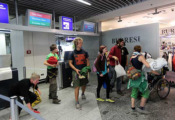 23.06.2014 Aktion: Blockade eines Zuganges zum Transitbereich des Frankfurter Flughafens, Terminal 1, Halle B, Ebene 2, von etwa 19.05 bis 19.30 Uhr. Freiwilliges Beenden der Aktion.