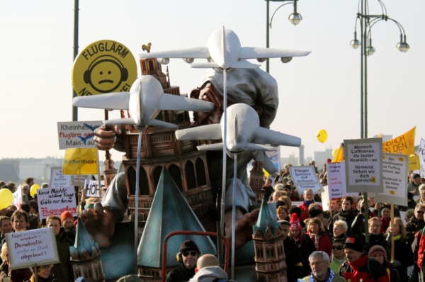 Motivwagen des MCV: Der Dutsche Michel im Schlafrock auf dem Mainzer Dom wehrt sich verzweifelt gegen Flugzeuge.