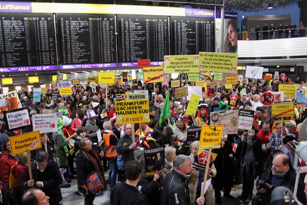 Etwa 2000 Menschen nahmen an der "Rosenmontagsdemonstration" im Terminal 1 des Frankfurter Flughafens teil.