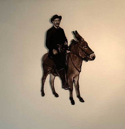 1. Juli 2014 Eröffung des Altheim-Kabinetts im Stadtmuseum Groß-Gerau Typisch Wilhelm Altheim: Hoch zu Esel mit Cowboy-Ausstattung unterwegs zum Kneipenbesuch.
