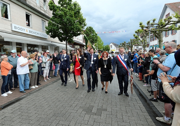 Festumzug Bürgermeister Stefan Sauer (Groß-Gerau, Bildmitte) mit den Vertretern der Partnerstädte an der Spitze des Festumzuges auf dem Weg zur Ehrentribüne.