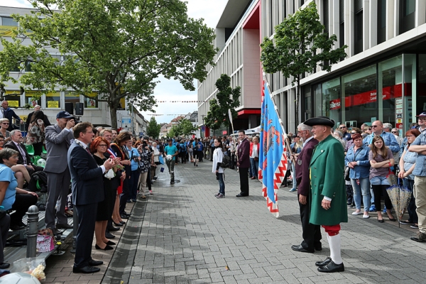Festumzug Privilegierte Schützengesellschaft Groß-Gerau mit Lebrecht Viebahn mit Hessens zweitältester Fahne vor den Ehrengästen