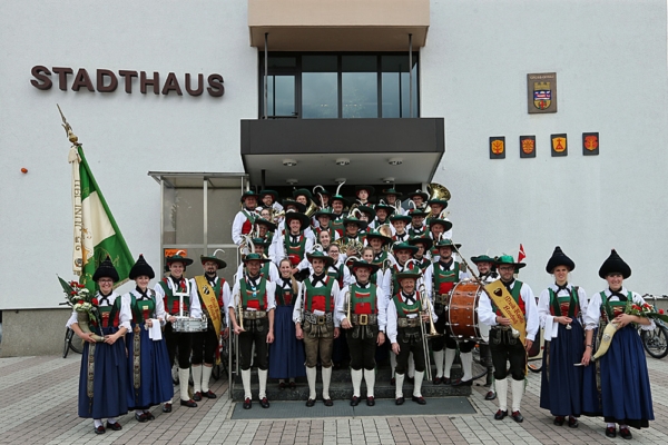Vor dem Festumzug Musik-Kapelle Reischach (Bruneck) Frage: was ist in den Hörnern?