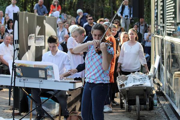 Oberstufenschüler der Ricara-Huch-Schule stellen Bilder zur Geschichte des Kellers unter der Küchenbaracke sowie seiner Freilegung.