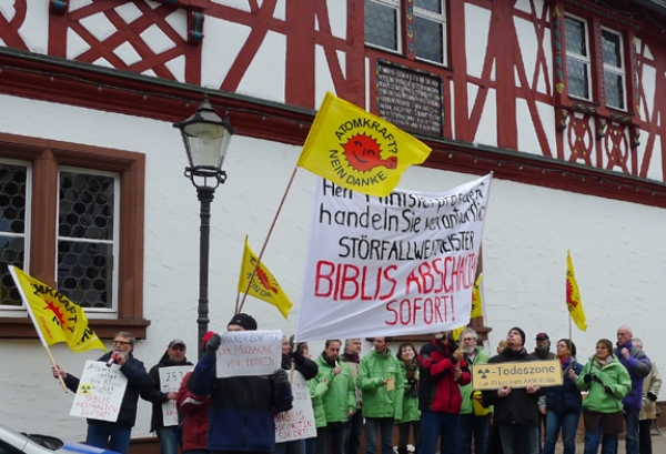 Vor dem Neujahrsempfang der CDU im Historischen Rathaus in Groß-Gerau gab es Protest gegen den "Weiterbetrieb der beiden Uraltmeiler in Biblis" vor dem Rathaus.