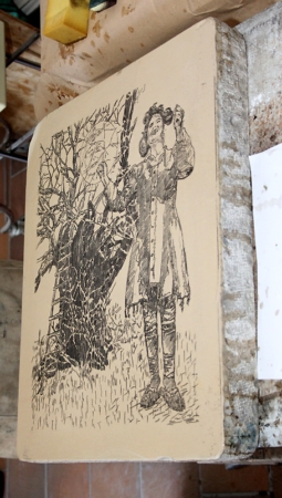 Derra hat sich schon während der Schulzeit intensiv mit Büchners Werk beschäftigt. Angeregt durch die Aufführung von „Leonce und Lena“ der #BüchnerBühne Riedstadt soll nun eine Kreidelithografie entstehen, die eine Szene aus dem Stück darstellen wird. #Christian Suhr, der Leiter der#BüchnerBühne Riedstadt , war bei dem Andruck anwesend.