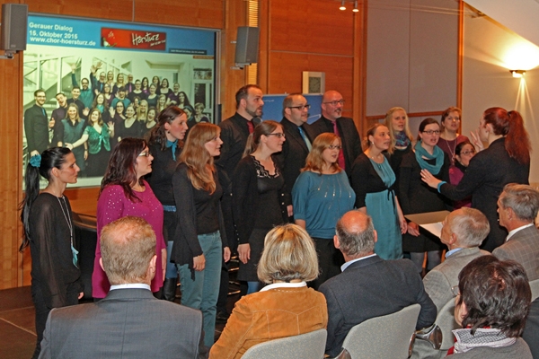 Der Chor "Hörsturz" aus Nauheim begleitete den Dialog musikalisch und kamen um eine Zugabe zum Ende der Veranstaltung nicht herum.