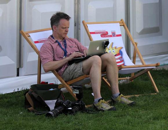 Hessentag 2014: Bensheim / Kreis Bergstraße Arne Dedert, Bildjournalist der dpa, mit Freiluftarbeitsplatz.