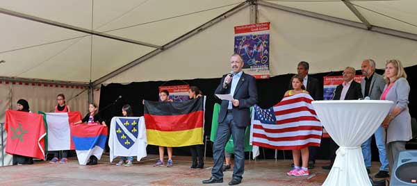 Bernd Landau, flankiert von Kindern mit verschiedenen Nationalflaggen, eröffnet die Interkulturellen Wochen 2014