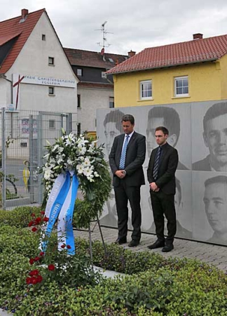 Di., 26. August 2014: Gedenkveranstaltung Oberbürgermeister Patrick Burghardt (l.) mit Bürgermeister Dennis Grieser Lynchmorde am 26.08.1944 in Rüsselsheim