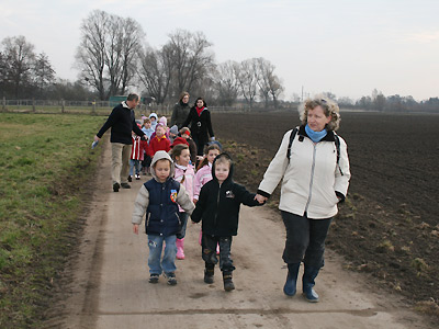 Am nächsten Tag gehen die Kinder zu einer Weide südlich des Dornberger Schlosses. Hier wird das Storchennest aufgestellt.