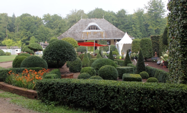 Im Schaugarten vor dem malerischen Teehaus werden Formgehölze in klassischem und auch verspieltem Look