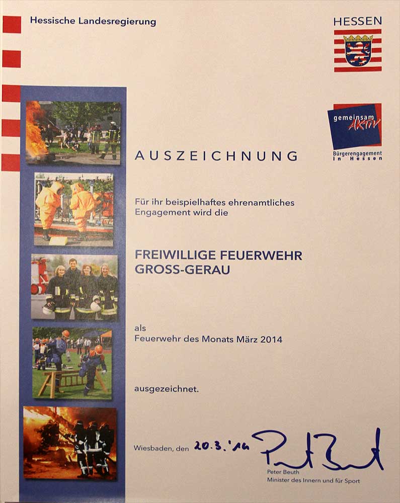 „Feuerwehr des Monats März 2014“ und überreichte die entsprechende Urkunde im Rahmen einer Dienstversammlung in der Stadthalle. Grundlage war die von der Pressesprecherin der Freiwilligen Feuerwehr, Susanne Nold, dem Innenministerium vorgelegte Ausarbeitung über die Leistungen im Brandschutz (Feuerwehrbedarfsentwicklungsplan) und über die vielfältigen Aktivitäten auch hinsichtlich der Mitgliederwerbung.