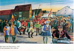 Die FAZ beschrieb seinerzeit das Gemälde: „Es zeigt marschierende Karnevalisten in Uniform auf einer der Rüsselsheimer Straßen, wo die amerikanischen Soldaten mißhandelt worden waren. Unter dem Asphalt der Straßen sieht man schemenhaft liegende Körper, aber auch Wehrmacntsoldaten und einen Mann mit einem Zeichen, das einem Davidstern ähnelt".