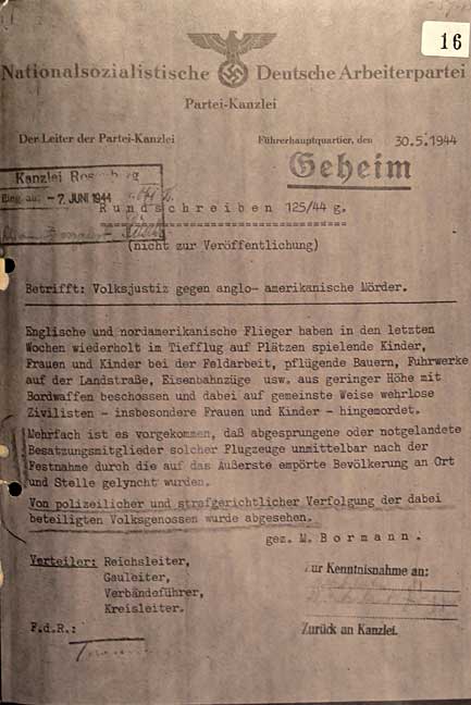 In einem Rundschreiben des Leiters der NSDAP-Parteikanzlei, Martin Bormann vom 30.5.1944 erteilten offizielle deutsche Stellen indirekt die Erlaubnis zu Angriffen auf abgeschossene alliierte Flugzeugbesatzungen.