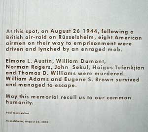 "At this spot, on August 1944, following a British air-raid on Rüsselsheim, eight American airmen on their way to an emprisoment were driven and lynched by an enraged mob.
