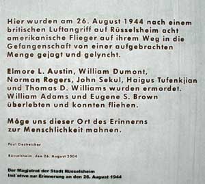 "Hier wurden am 26. August 1944 nach einem britischen Luftangriff auf Rüsselsheim acht amerikanische Flieger auf ihrem Weg in die Gefangenschaft von einer aufgebrachten Menge gejagt und gelyncht. Elmor L. Austin, William Dumont, Norman Rogers, John Sekul, Haigus Tufenkjian und Thomas D. Williams wurden ermordet. William Adams und Eugene S. Brown überlebten. Möge uns dieser Ort des Erinnerns zur Menschlichkeit mahnen."