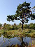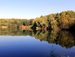 Ungeschichteter Teich (Kiessee) mit Naturbereich.