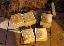 Der Künstler Gunter Demnig verlegte die ersten fünf Stolpersteine. Diese erinnern an Julius und Frieda Kahn mit Sohn Karl, die nach einer Flucht aus Deutschland in den USA überlebten sowie an Leopold und Johanna Kahn, die 1942 nach Auschwitz deportiert und dort ermordet wurden. Nachkommen von Julius und Frieda Kahn – Gary und Jay Kahn – waren aus den USA angereist und bei der Stolpersteinverlegung anwesend.