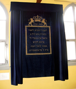 Der blaue Samtvorhang für den Toraschrein wurde 1867 zur Einweihung der neuen Synagoge in Biebesheim gestiftet. Die Übersetzung des hebräischen Textes lautet
