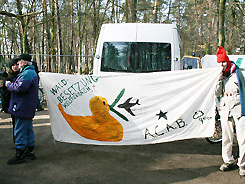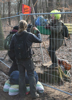 offensichtlich der Sichtkontakt zu der Person hergestellt. Es werden Decken, Holzteile und eine Matratze aus dem "Bunker" entfernt. Der "Eingeschlossene" wird von einem anderen Aktivisten aus dem Camp mit Lebensmittel (Brötchen und Äpfel) sowie mit Getränken versorgt.