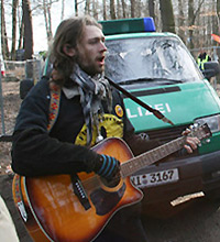 Gerichtsvollzieher im Camp der Flughafenausbaugegner im Kelsterbacher Wald den durch die Fraport erwirkten gerichtlichen Räumungsbeschluss bezüglich des besetzten Rodungsgeländes umzusetzen. Durch ihn erfolgt über Megafon die Verlesung und Umsetzung des durch das Landgericht Darmstadt erlassenen Beschlusses.