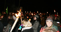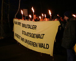 Straße über die Gelbe Grundschneise in Richtung Camp statt. Viele der Teilnehmer tragen brennende Fackeln. Nach dem Ende der Aktion, die friedlich verläuft, gingen noch einmal etwa 30 Personen in Richtung des Hüttendorfes.