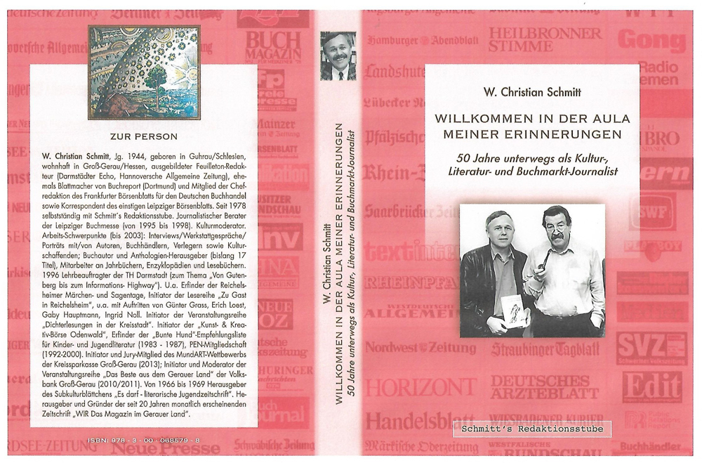 W. Christian Schmitt , Jg. 1944, geboren in Guhrau/Schlesien (polnisch Góra), in der hessischen Kreisstadt Groß-Gerau lebend, seit mehr als 50 Jahren auf Kultur-, Literatur- und Buchmarkt-Themen spezialisierter Journalist, zudem seit fast 25 Jahren Herausgeber (und Gründer) des im Gerauer Land monatlich erscheinenden WIR-Magazins (Auflage: 27.500 Exemplare (Stand: 2021)), legt unter dem Titel "Willkommen in der Aula meiner Erinnerungen" seine berufliche Lebensbilanz vor.
